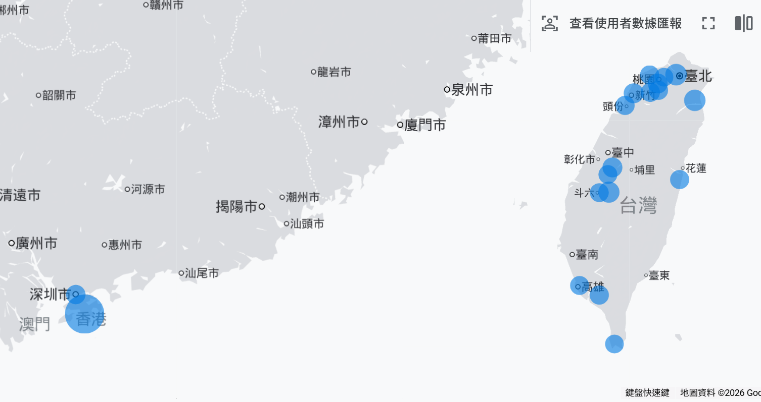 來自台灣、香港的流量,分布在不同的城市或區域,訪客隨時間有變化起伏,不會只在一個城市或全天24小時固定人數。